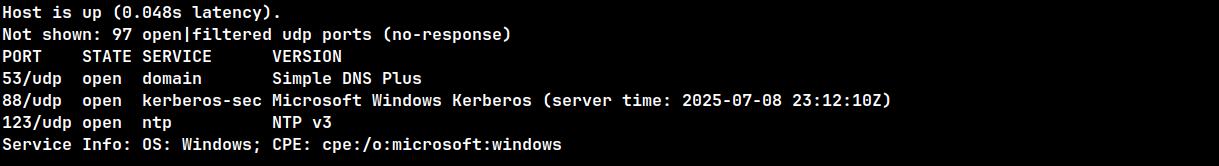 Nmap UDP scan against the target:
