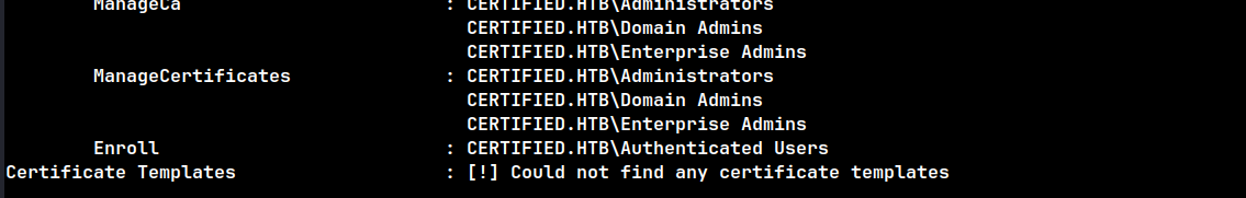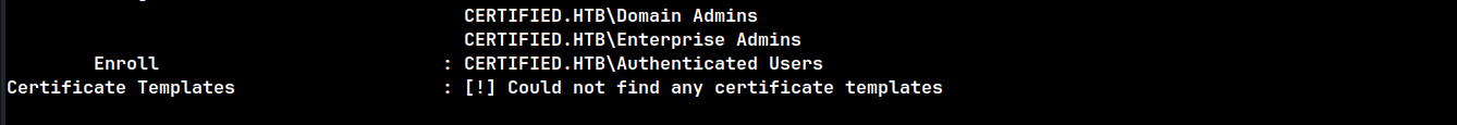 certipy find -u 'judith.mader' -p 'judith09' -dc-ip 10.129.231.186 -target certified.htb -enabled -vulnerable -stdout