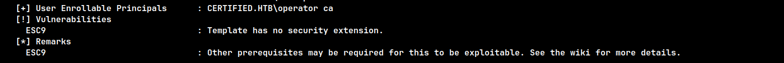 Certificate enumeration revealed that ca_operator is vulnerable to ESC9: