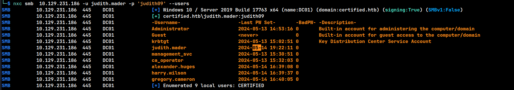 nxc smb 10.129.231.186 -u judith.mader -p 'judith09' --users